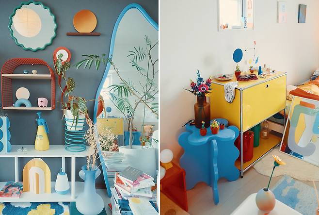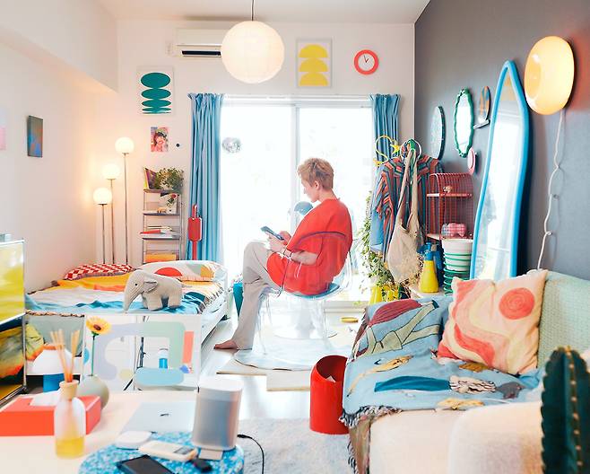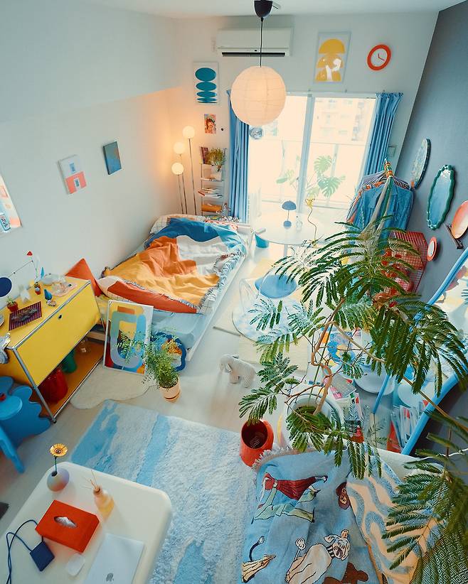 컬러의 밸런스와 가구 디자인의 통일감이에요. 제 인테리어 콘셉트가 ‘화려하고 귀여운 방’이거든요. 여러 가지 컬러와 모티프가 화려하게 어우러지면 자칫 균형을 잃을 수 있다고 생각해요. 그 점을 염두에 두고 콘셉트에 맞게 믹스 매치해요. 제가 가장 좋아하는 컬러가 블루인데요. 블루와 화이트를 메인 컬러로 사용하고 오렌지, 옐로, 레드 등을 대조적으로 배치해 포인트를 주지요.