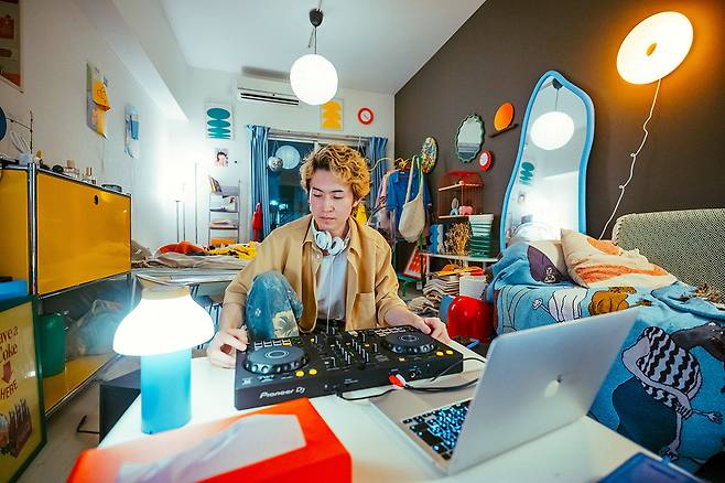 디제잉을 하는 거실이요. 아침에 일어나 거실에서 우타다 히카루의 곡으로 믹스하는 것이 루틴이에요. 사실 디제잉을 시작한 지는 한 달 정도 되는데요. 우연히 유튜브에서 DJ 믹스 영상을 보고 반해 곧바로 장비를 구입하고 몰두하게 됐어요. 제가 좋아하는 곡을 선곡하고 이 곡들이 자연스럽게 이어졌을 때의 쾌감이 기대 이상의 희열을 선사한답니다.