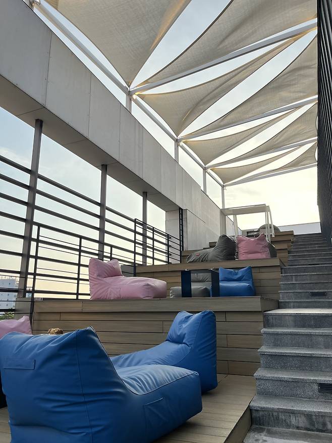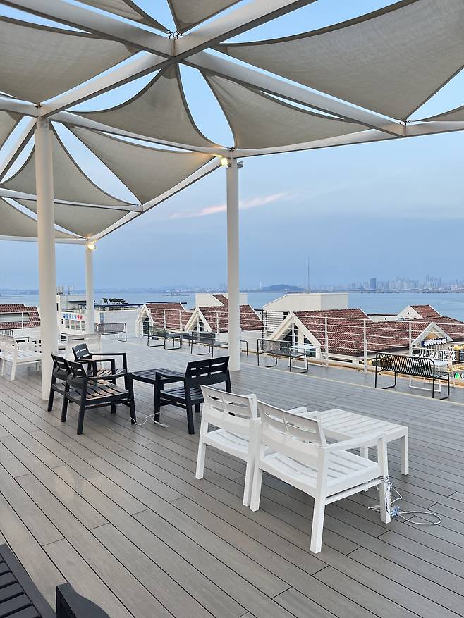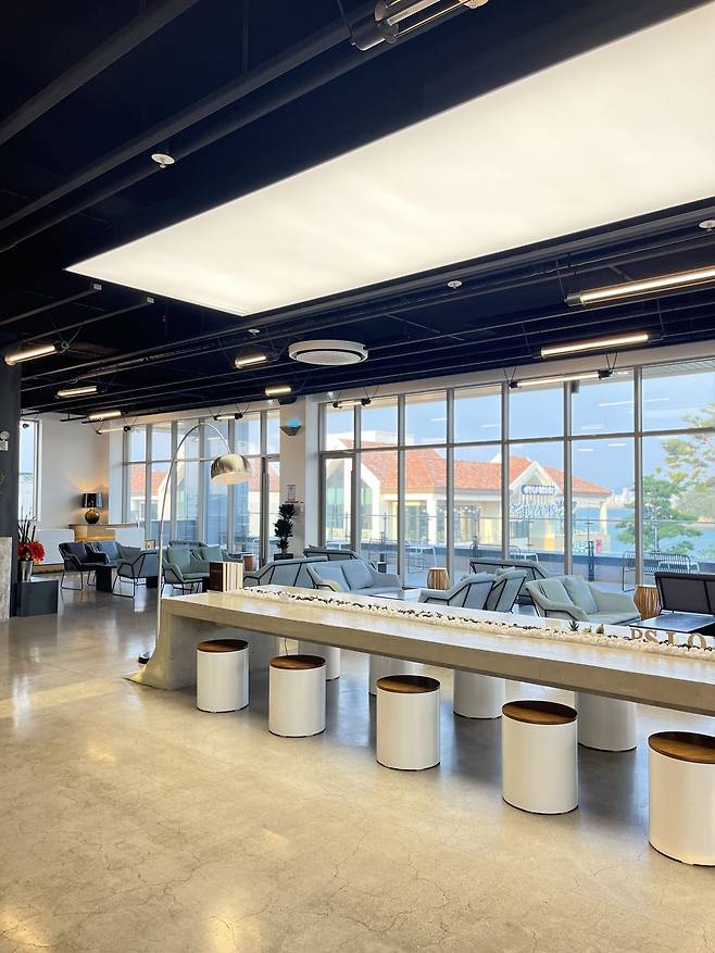 카페 평상인은 실내도 넓지만, 바다를 마주한 야외 테라스가 특히 인상적이에요. 날씨가 맑은 날이면 하늘과 바다가 맞닿은 시원한 풍경이 펼쳐지고, 선선한 바닷바람을 맞으며 차 한 잔을 즐기기 딱 좋죠. 바닥에 평상이 놓여 있거나 테이블이 넉넉하게 배치돼 있어, 주말이나 휴일이라도 비교적 편안하게 자리를 잡을 수 있습니다.