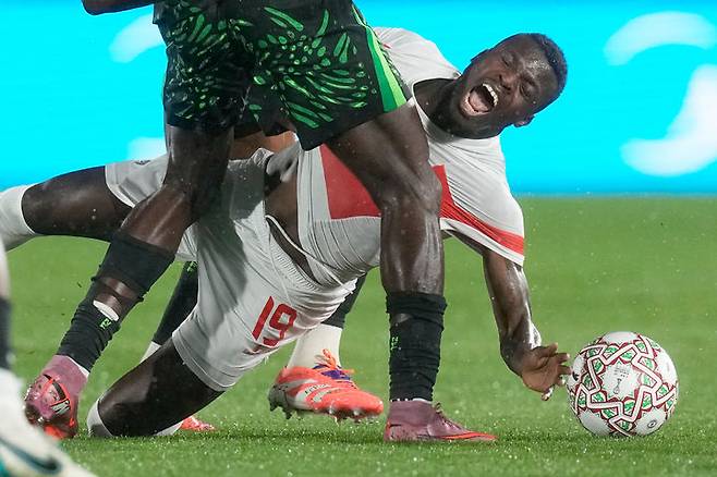 [페스=AP/뉴시스] 나이지리아의 윌프레드 은디디(왼쪽)가 5일(현지 시간) 모로코 페스의 페스 스포츠 콤플렉스에서 열린 2025 아프리카 네이션스컵(AFCON) 16강전 모잠비크와 경기 중 공을 다투고 있다. 빅터 오시멘이 멀티 골을 기록한 나이지리아가 4-0으로 승리하고 8강에 진출했다. 2026.01.06.