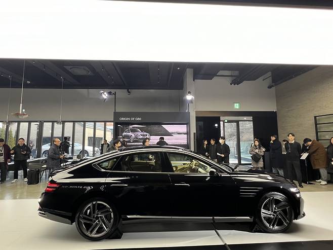 5,005x1,925x1,465mm의 크기. A필러부터 C필러까지 매혹적인 실루엣, G80만의 역동성을 나타냈다. 헬리콥터가 도는 문양의 20인치 휠, 베이지 톤의 실내, 제네시스만의 한국적 아름다움을 드러냈다.