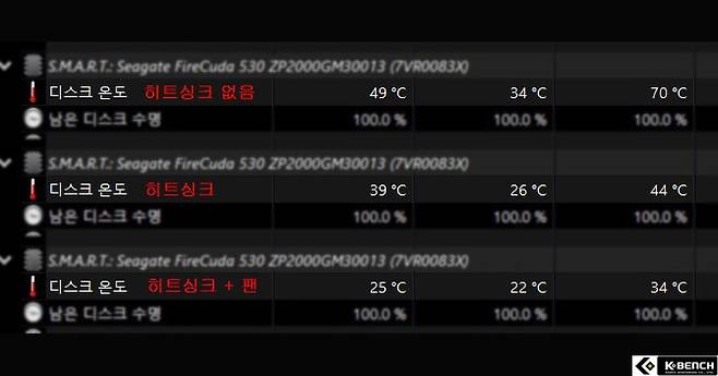실제, M.2 SSD 온도 차이를 비교하면 히트싱크 설치 이전 보다 26도나 내려간 것이 확인됐다. 히트싱크 조합에 더해 케이스 내부 공기 흐름을 개선하거나 케이스팬을 통해 직접 외부 공기를 흐르게 만들면 70도 였던 SSD 온도가 34도까지 내려갈 수 있어 과열로 인한 쓰로틀 문제는 걱정하지 않아도 된다.