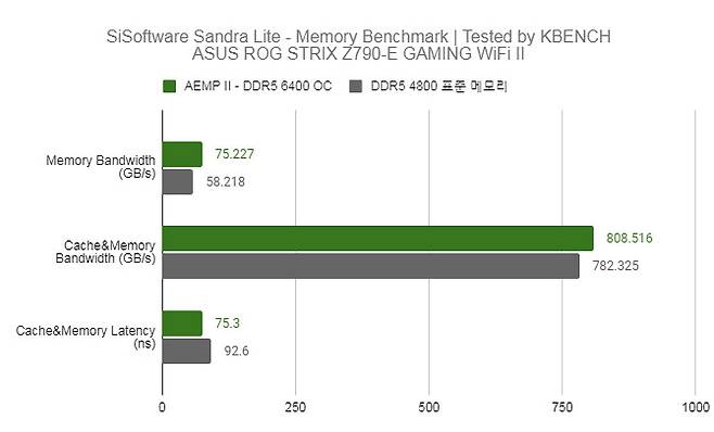 필자는 하이닉스 DDR5-4800 메모리를 AEMP II 기능으로 DDR5-6400에 CL38-42-42-143으로 동작시켰으며 이를 통해 메모리 대역폭과 지연시간을 크게 개선시킬 수 있었다.