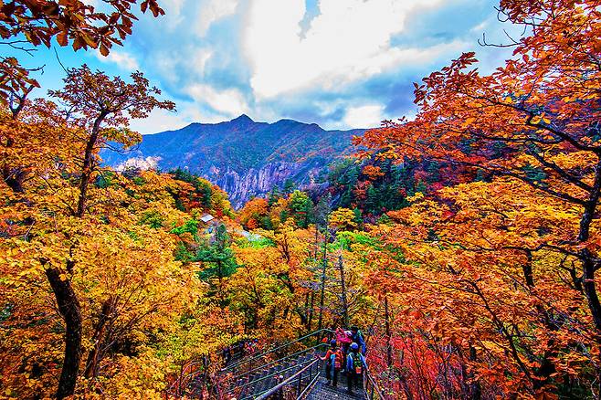 설악산은 가을이 되면 온 산이 단풍으로 물드는 대표적인 가을 명소로, 웅장한 자연 풍경을 감상할 수 있는 곳입니다.