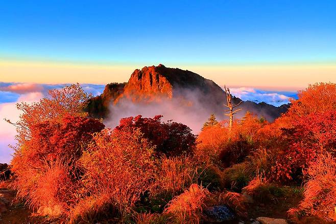 지리산은 가을 단풍산행으로 손꼽히는 명소로, 붉게 물든 산 전체가 환상적인 가을 풍경을 자아냅니다.
