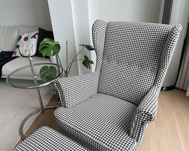 이케아에 방문했다가 하운드투스 체크 패턴이 너무 맘에 들어서 얼떨결에 구입했던 윙 체어입니다. 주로 햇빛을 쬐거나 책 볼 때 앉아있곤 하는데요. 등받이 각도 조절이 되지 않고 커버를 세탁할 수 없는 치명적인 단점이 있습니다.