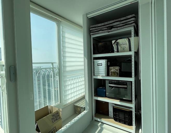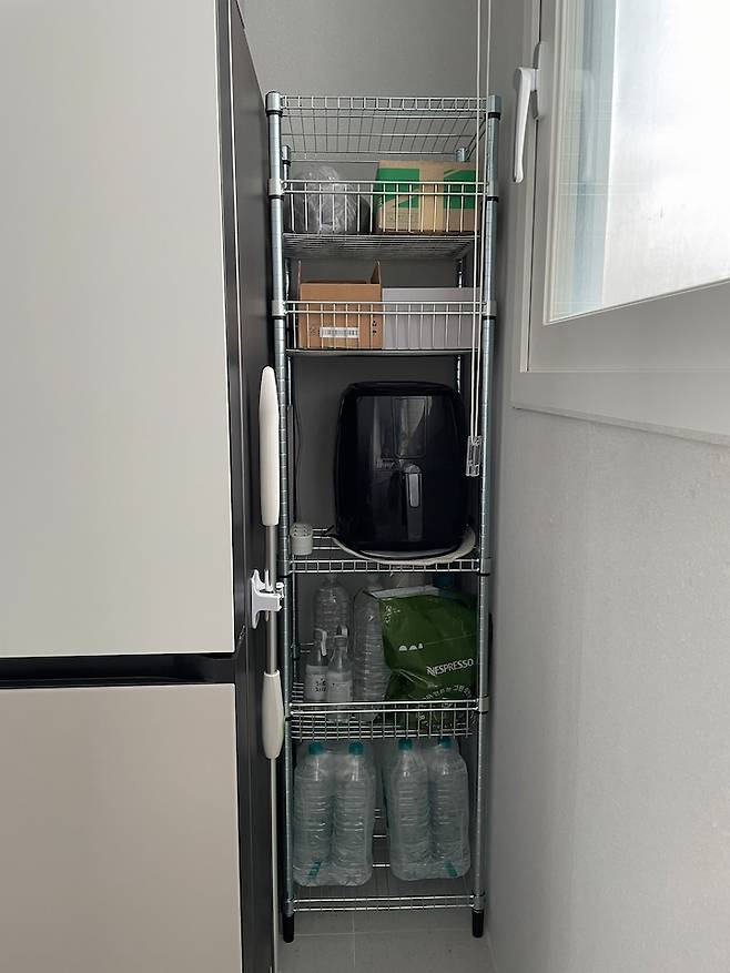 베란다에 위치한 냉장고 옆에는 양파, 감자, 마늘 등 실온에 보관해야 하는 식재료들을 위해서 선반을 구입했는데, 구성이 다른 두 종료의 선반을 쓰임새에 맞게 구성해서 설치했습니다. 수납장이 있었다면 깔끔해서 좋았을텐데라는 아쉬움이 있기도 합니다.