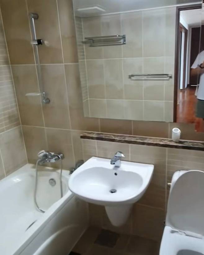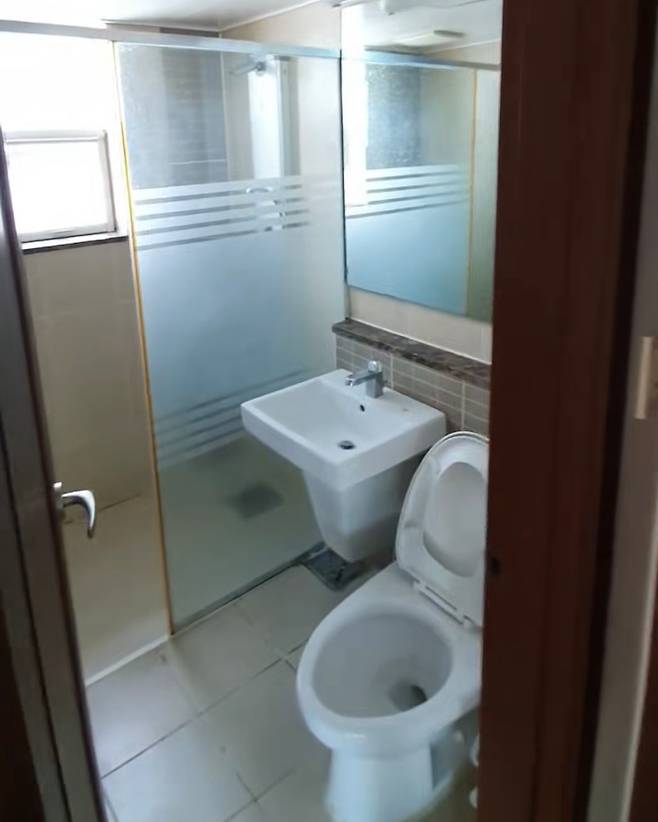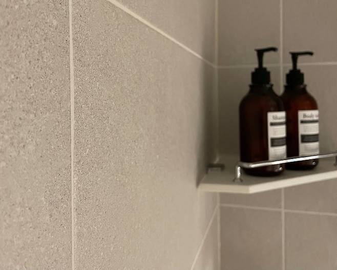화려하지 않은 베이지 색상의 테라조 타일입니다. 600각 타일로 시공하고 싶었지만 예산 문제로 기본 타일을 선택했는데요. 생각보다 욕실 분위기를 은은하게 만들어 주어 사용하면서도 만족하고 있습니다.