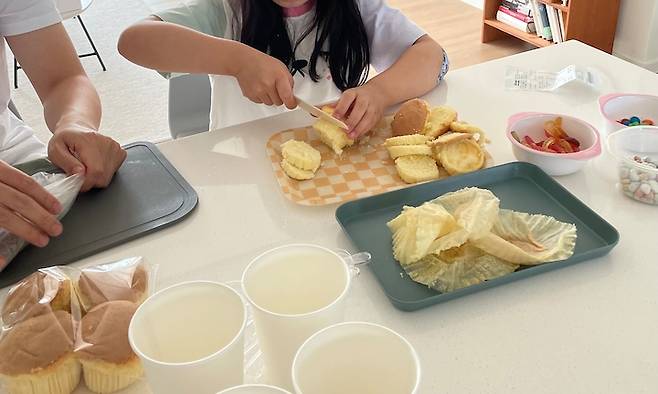 예전 ㄱ자 주방에서는 협소한 공간 때문인지 언제나 조급함과 복잡한 상태에서 요리를 했던 기억이 있습니다. 그래서 언제나 아일랜드 식탁이 놓여진 ㄷ자 주방을 꿈꿔왔습니다. 아일랜드 식탁이 있는 이 공간은 남편이 요리 재료 손질을 도와주면서 오늘 하루 있었던 일을 도란도란 이야기 나누기도 하지만 사진처럼 꼬마 손님이 놀러오면 요리 수업도 즐길 수 있는 멋진 공간이 됩니다.