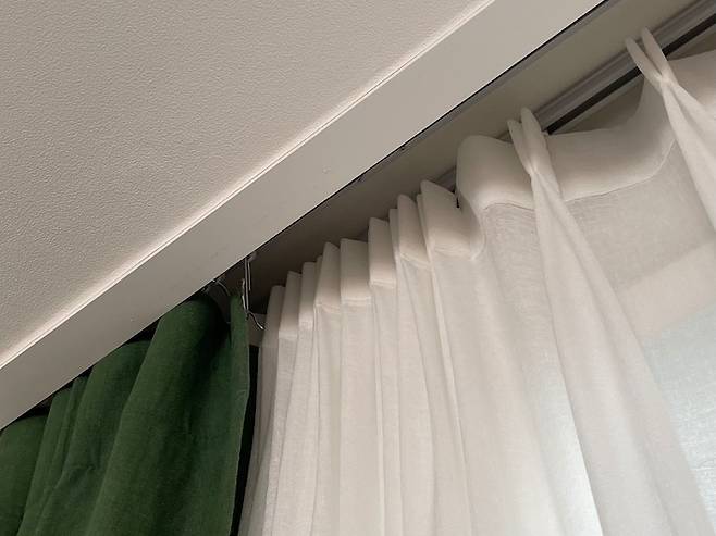 주방과 베란다 사이에는 커튼을 설치했어요. 거실, 침실에서도 보여지는 대부분의 커튼은 기존에 사용하던 커튼을 재사용하였어요. 가지고 있던 커튼이 짧아 밑단만 늘려서 사용 중입니다. 주방에 걸린 초록색 커튼도 수선을 하였지만 6cm정도 짧아 다이소 s고리를 이용해 걸어주었습니다.