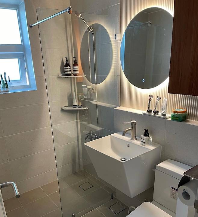 베이지 타일과 어울리는 우드 색상의 수납장은 인테리어 업체에서 추천해주었는데 욕실 분위기와 아주 잘 맞는 것 같습니다.
