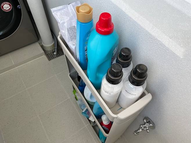 세탁실은 통로 확보가 중요합니다. 빨래감을 들고 왔다갔다 해야하니까요. 각종 세제를 넣어두기 편리한 틈새 수납장을 놓았는데 공간 활용에 너무 좋습니다.
