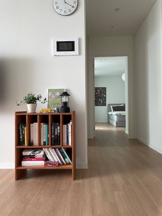 거실 한쪽엔 아담한 사이즈의 라왕 책장을 두었는데 제가 좋아하는 책들, 소품들로 채워봤습니다.