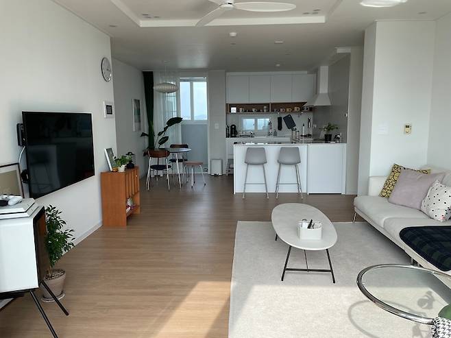 거실에서 주방을 바라보았을 때 공간이 최대한 넓어 보이게 만들고 싶어서 기존에 있던 파티션을 제거한 모습입니다.