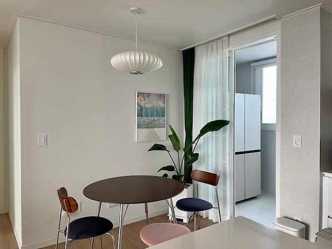 싱크대 맞은 편에는 식탁을 두었습니다. 처음 계획은 냉장고 장을 설치하는것이었는데 냉장고를 베란다로 옮기고 원형 식탁을 두어 공간에 여유를 두고자 했습니다. 식사는 주로 이곳에서 하는데요. 월넛 상판이 화이트 인테리어와 잘 어울리고 공간에 아늑함을 더해줘서 사용한 지 1년이 지난 지금도 만족하는 가구 중 하나입니다.