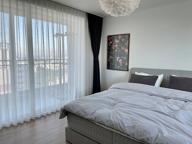 라지 킹 사이즈의 침대를 두어도 넉넉한 공간이며 사랑스러운 깃털조명을 달아주었습니다. 액자 아래에는 협탁을 놓을 예정입니다.