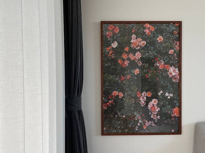 70x100 사이즈의 대형 액자를 침대 옆 벽면에 걸어두었습니다. 로즈 포스터에 우드 프레임을 선택하여 침실에 아늑함을 주고 싶었습니다.