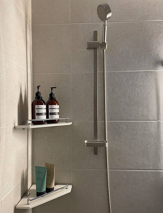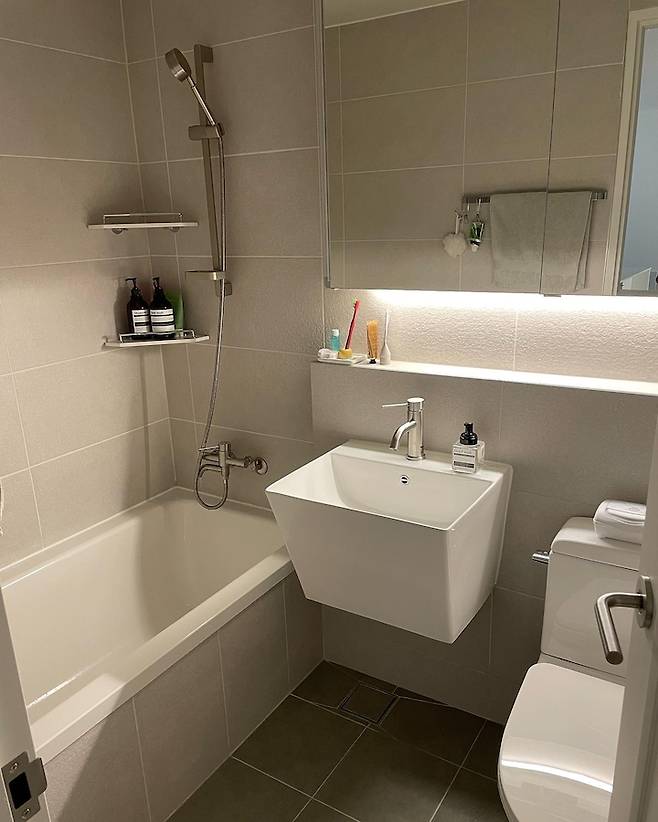 샤워는 자주 이용하는 안방 욕실에서 하고 있고 가끔씩 뜨끈뜨끈한 물 받아 몸 녹이고 싶을 땐 욕조가 있는 공용 욕실을 사용하고 있습니다. 공용 욕실은 안방 욕실과 다르게 그레이 색상의 타일을 선택하였고 욕조 옆면까지 타일을 올려 붙여 최대한 깔끔한 느낌을 주려고 했습니다.