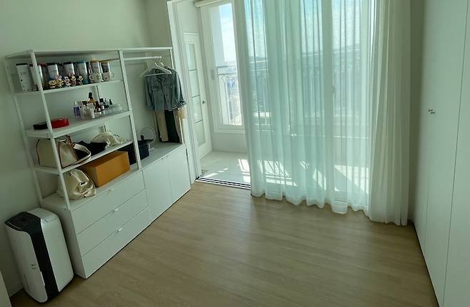 작은 방 2곳 중 안방과 가까운 방을 드레스룸으로 만들었습니다. 한쪽 벽은 붙박이장을 설치해 대부분의 옷을 수납하고 있고 맞은편에는 오픈 옷장을 두어 자주 사용하는 물건을 수납하고 있습니다.