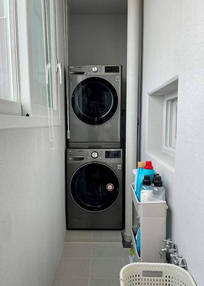 세탁기와 건조기 일체형 모델을 꿈꿨던 저는 세탁실의 협소한 공간에 낙담할 수 밖에 없었습니다. 세탁기 용량을 줄이기로 결정하였고 드럼 세탁기중 크지도 작지도 않은 15kg 세탁기와 9kg 건조기를 설치하여 사용 중에 있습니다. 겨울에 사용하는 두꺼운 이불은 빨래방을 이용하지만 그 외의 빨래들은 다 소화하고 있습니다.