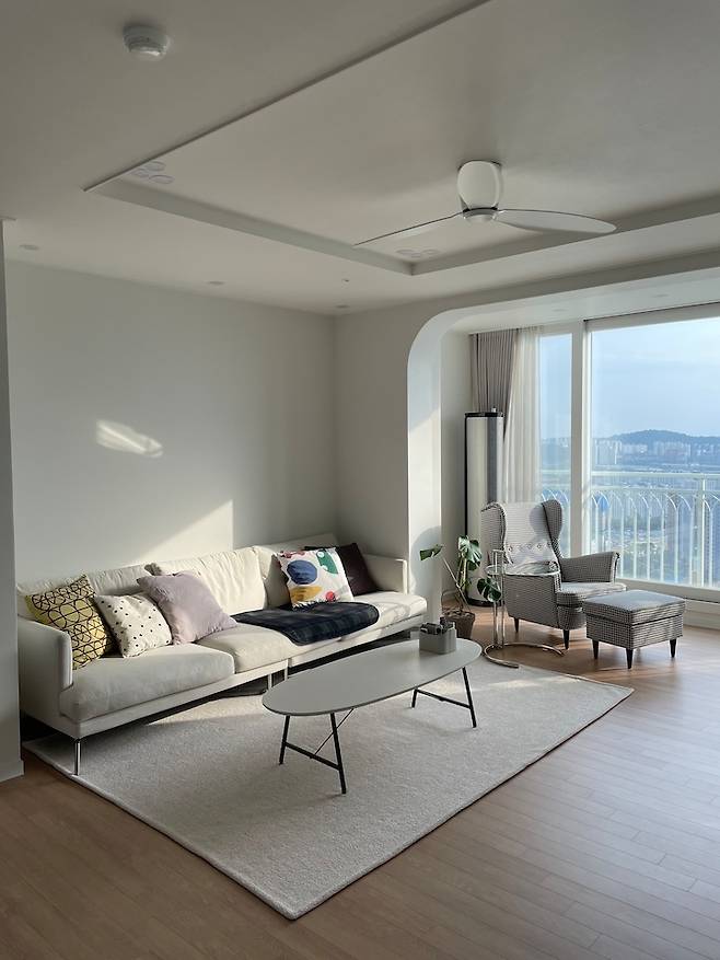층고가 약 2.6m로 꽤 높은 편이라 실링팬을 설치하기 충분하였습니다. 실링팬은 봄부터 가을까지 요긴하게 잘 사용하고 있습니다. 시스템 에어컨 공사는 하지 않았고 신혼 때부터 사용해오던 에어컨을 재설치하여 사용 중에 있습니다.