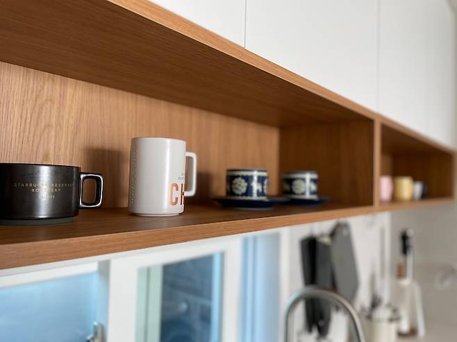 개수대 상부장 아래에 우드 느낌의 오픈장을 두어 포인트를 주었습니다.