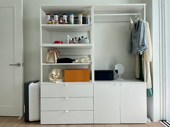 이케아에서 구입한 플랏사라는 옷장입니다. 개인의 취향에 맞게 구성할 수 있지만 이케아에 방문해 알맞게 구성된 상품을 구매했습니다. 자주 쓰는 양말, 속옷, 잠옷은 3단 서랍장에, 가방이나 취미로 모으는 텀블러는 오픈 선반에, 외출 후 입은 옷들은 오픈 옷걸이에 걸어 사용하고 있습니다. 아직 화장대를 고르지 못해 화장품도 이곳에 있네요.
