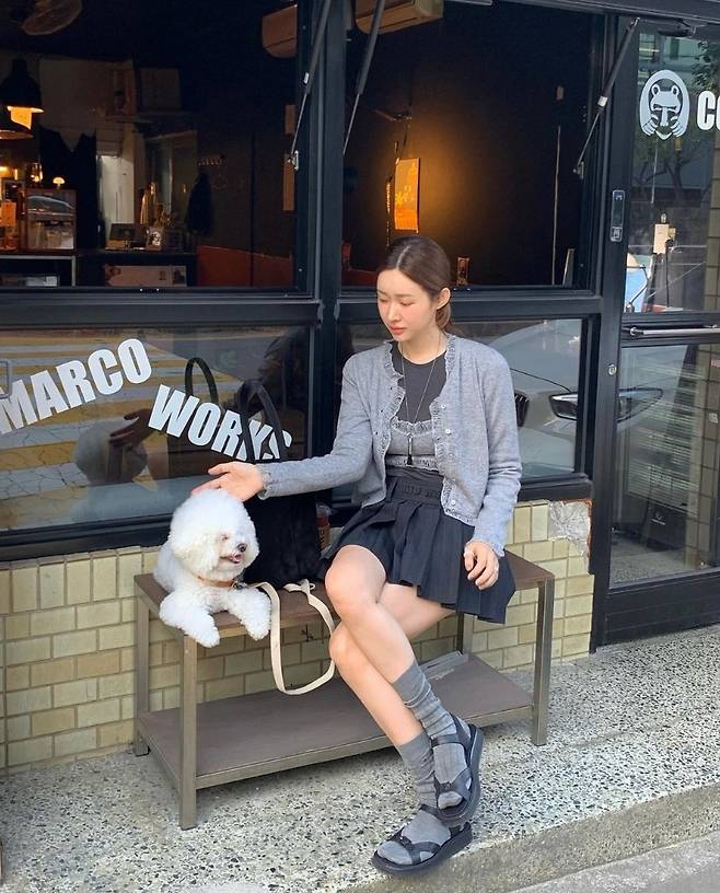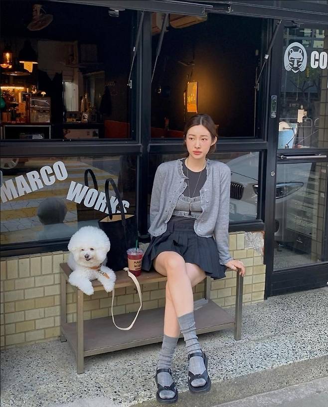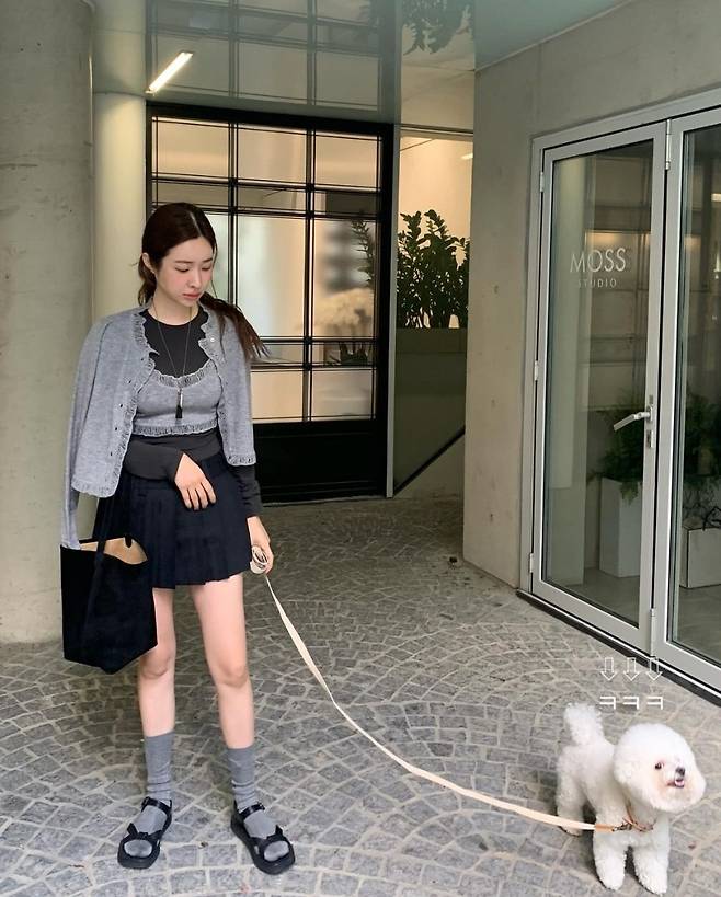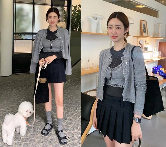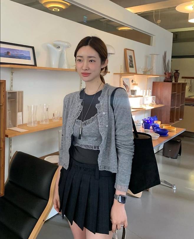 차정원은 그레이 컬러의 카디건과 미니 크롭 톱을 레이어드해 내추럴한 무드를 자아냈습니다.