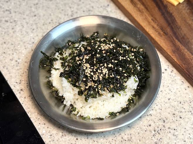 2️⃣ 밥에다가는 김자반과 깨소금, 참기름을 뿌려줬어요. 후리가케 있으신 분들은, 김자반 대신 사용해주셔도 맛있어요!