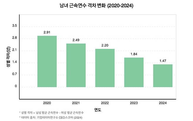 이로 인해 남녀 간 근속연수 격차는 2.91년에서 1.47년으로 크게 줄어들었습니다.