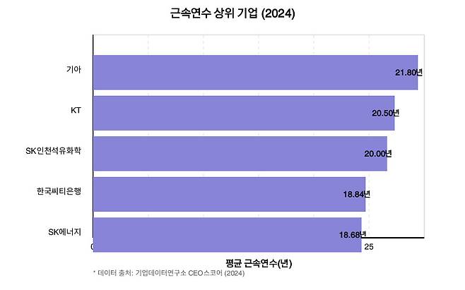 이어 KT(20.50년), SK인천석유화학(20.00년), 한국씨티은행(18.84년), SK에너지(18.68년) 순이였습니다.