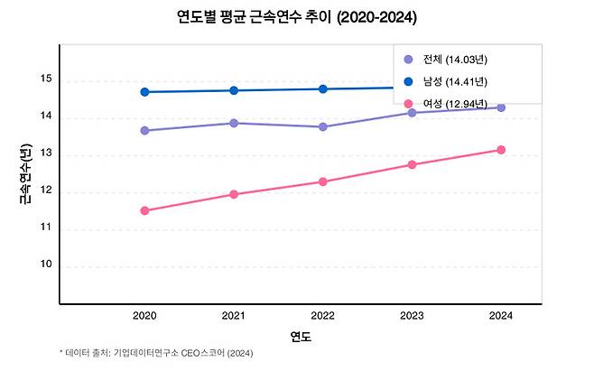 주목할 만한 점은 여성 직원들의 근속연수가 2020년 11.38년에서 2024년 12.94년으로 1.56년이나 늘었다는 사실입니다.