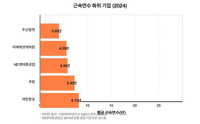 반면 두산밥캣(3.20년), 미래에셋캐피탈(4.20년), HD현대중공업(4.30년) 등은 상대적으로 짧은 근속연수를 보였습니다.