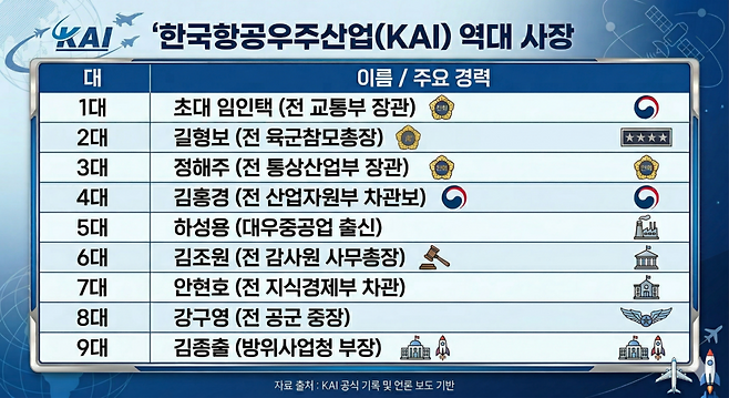 다만 최근에는 코드인사가 리스크로 작용했다. 강구영 8대 사장은 윤석열 전 대통령 대선캠프 출신으로 지난해 6월 이재명 정부가 출범하자 사퇴했다. KAI는 강 사장이 물러난 이후 8개월 동안 리더십 공백을 겪으면서 주요 사업에서의 실주와 노사 갈등이 이어졌다. 정권 교체에 따른 리더십 불확실성이 현실이 된 사례다.