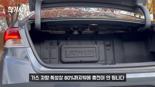 일반 주유소는 전국에 약 1~2만 개 정도 있는 거에 반해서 LPG 충전소 같은 경우에 전국에 약 2,000여개 정도밖에 없기 때문에 집 근처나 직장 근처에 만약 충전소가 없다면 가스에 경고등이 들어왔을 때 굉장히 쫄깃쫄깃한 경험을 하실 수가 있을 겁니다. 또 다른 단점은 출고된 LPG 차량들의 공통적인 단점으로 바로 가스탱크로 인해서 트렁크 공간이 굉장히 좁다는 게 단점입니다. 24인치 캐리어 두 개도 겨우 들어갈 정도의 공간만 활용할 수 있어서 분명히 이 모델 중형 세단으로서 패밀리 세단인 성향이 강한데 짐을 많이 싣기에는 무리였습니다. DN8 쏘나타에 와서는 도넛형 봄베로 바뀌면서 적재 공간이 늘어났지만, 뉴 라이즈까지는 반대로 트렁크 공간이 좁습니다.