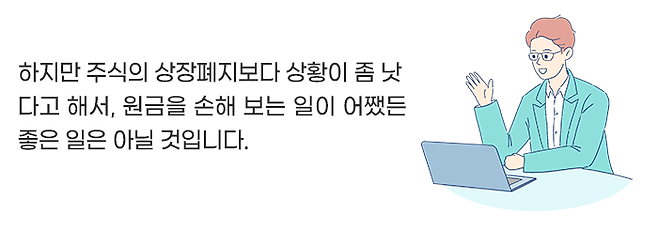 물론 상장폐지 시점의 자산가치에 따라 최종적으로 수익 또는 손실을 볼 수도 있지만 투자금 회수가 어려운 주식보다는 낫다고 볼 수 있습니다.
