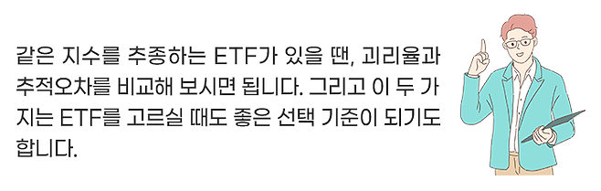 한 가지 팁을 더 드리자면, 운용자산(순자산규모)이 많을수록 비용이 덜 발생하고 거래량이 많으면 괴리율도 낮아질 수 있어서 이 부분도 같이 고려해 보시면 좋을 것입니다.