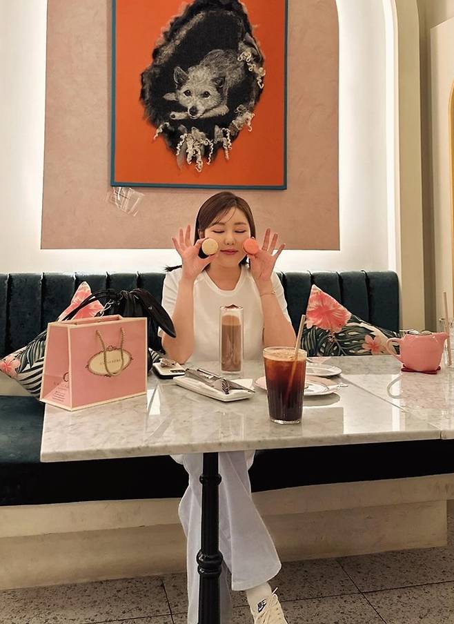 공개한 사진에서 송가인은 화이트 반팔 티셔츠에 그레이 팬츠를 착용한 꾸안꾸 데일리룩에 토끼 가방와 마케롱을 이용한 다양한 포즈로 귀요미를 폭발시켰다.