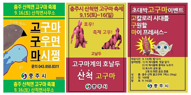 2017년 충주시 페이스북 페이지에는 다소 수상한 고구마 축제 홍보 포스터가 업로드된다. 그림판으로 만든 저퀄리티 포스터에선 난데없는 삼행시가 눈에 띈다. ‘고고구마 구구우면 마마시쩡’ 관공서 특유의 정형화된 스타일을 벗어난 이 홍보 게시물은 어이없게 재미있고 황당하게 매력적이라는 평을 받으며 많은 이들의 관심을 받았고 급기야 뉴스에도 소개된다. 이런 반응에 힘입어 2018년 고구마 축제 때에는 유명 축구 선수 크리스티아누 호날두 특유의 세리머니 포즈에 고구마를 엉성하게 합성한 ‘호우! 축제 고우! 고구마계의 호날두’ 포스터가 등장한다. 그 외에도 영화 〈반지의 제왕〉에 나오는 캐릭터 ‘골룸’이 한 손에 고구마를 든 채 ‘고고칼로리 시대를 구구원할 마마이프레셔스~’라고 외치는 등 기상천외한 포스터가 줄지어 올라온다. B급 감성의 고구마 축제 게시물은 순식간에A급 반향을 일으켰고, 당시 충주시는 청와대를 제치고 정부 기관 페이지 도달률 1위를 기록한다.