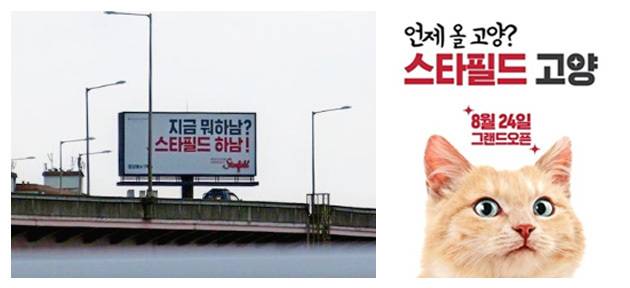 두 번째는 스타필드 고양이었다. ‘~할 고양?’과 같은 ‘고양’체로 유명한 도시에 스타필드가 오픈하다니. 이곳을 널리 알려 스타필드를 흥하게 하여라! 말장난의 신이 우리를 도와주는 기분이었다. 이번엔 귀여운 고양이를 모델로 한 옥외 광고에 ‘언제 올 고양? 스타필드 고양!’이라는 카피를 큼지막하게 더 했다. 지하철 스크린부터 명동 신세계 백화점 본점까지, 여러 곳에서 우리가 만든 광고를 볼 수 있었다.