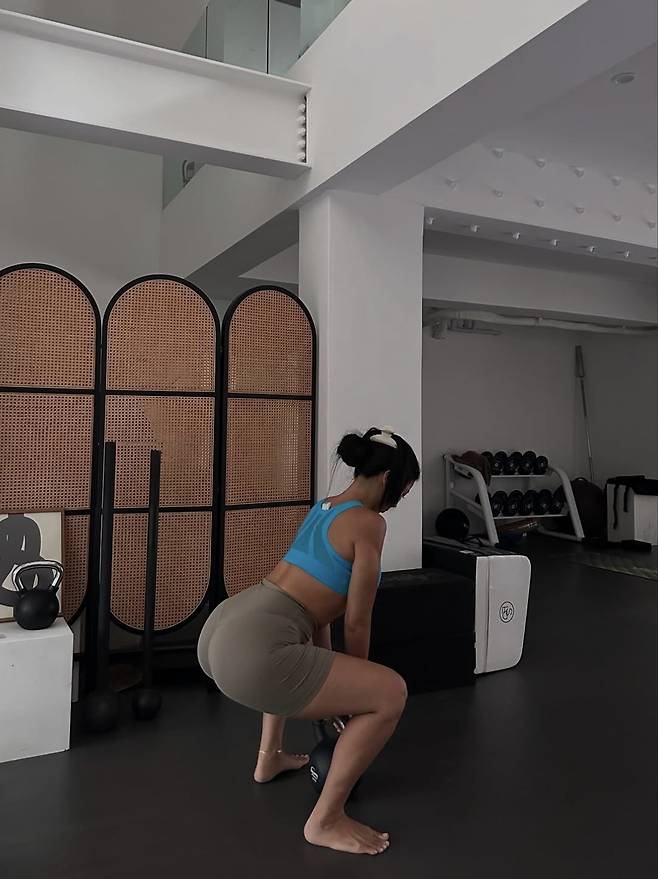 이어 케틀벨 스쿼트로 하체와 코어 근육을 강화했습니다. 발바닥을 단단히 고정한 채 깊숙이 앉아 올라오는 동작은 엉덩이와 허벅지 라인을 만드는 데 탁월한 효과가 있습니다. 제이제이는 정확한 자세로 하체의 힘을 고르게 쓰며 ‘교과서 같은 동작’을 선보였습니다.