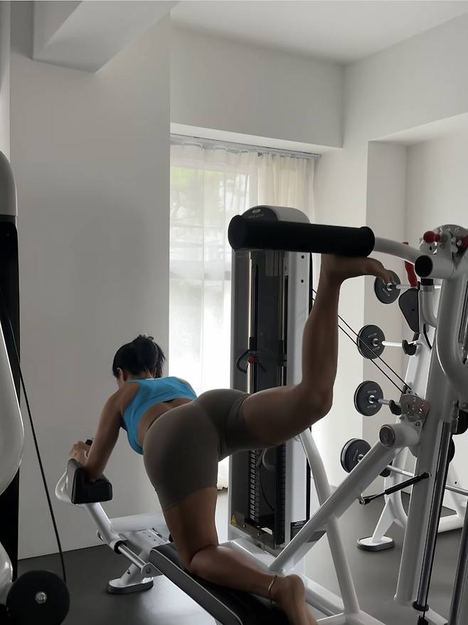 또한 머신을 활용한 힙 익스텐션 동작에서는 한쪽 다리를 들어 올리며 둔근 자극을 극대화했습니다. 허리를 과도하게 꺾지 않고 엉덩이 근육만을 집중적으로 사용해 ‘애플힙’을 완성하는 루틴입니다.
