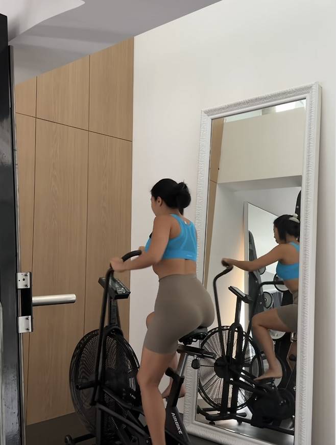 첫 번째는 에어바이크 유산소입니다. 상체와 하체를 동시에 움직이는 전신 운동으로, 짧은 시간에도 높은 칼로리 소모가 가능한 고강도 프로그램입니다. 제이제이는 흐트러짐 없는 자세로 페달을 밟으며, 강한 지구력과 집중력을 드러냈습니다.