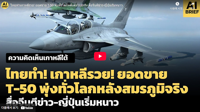 태국 유튜브 채널에는 "태국이 한국을 부자 만들었다! T-50 판매 폭발"이란 제목의 영상이 올라왔고, 조회수는 수십만을 넘겼습니다. 영상엔 "전투기 생산 국가들은 앞으로 테스트를 태국에 맡겨라. 태국에서 입증되면 불티나게 팔릴 거다"는 댓글이 달렸습니다.