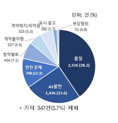 6천96건의 상담을 사유별로 분석하면 온도 조절기 작동 불량 등 '품질' 관련 상담이 38.2%(2천326건)로 가장 많고, '애프터서비스(AS) 불만' 23.6%(1천436건), '안전 문제' 12.3%(748건), '청약 철회' 7.1%(434건) 등의 순이다.