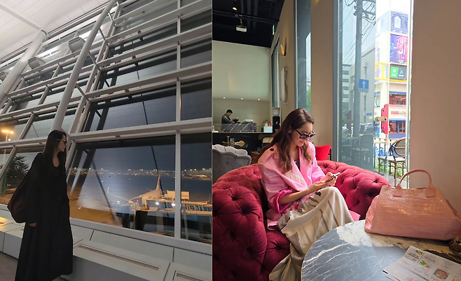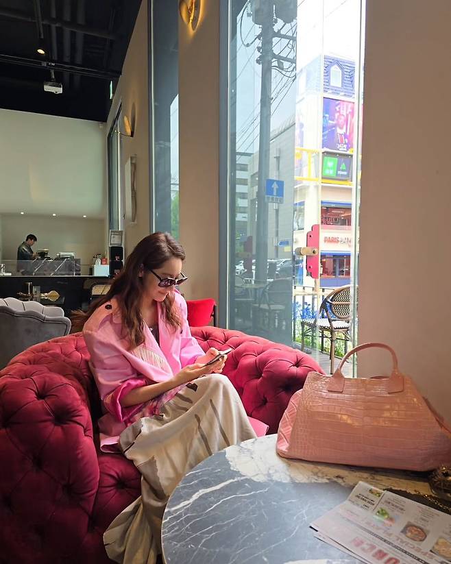 첫번째 사진에서는 윤지민이 핑크 셔츠와 플로럴 패턴 스커트를 매치하여 로맨틱한 무드를 연출했다. 톤온톤으로 매치된 핑크 컬러의 크로커다일 텍스처 백은 고급스러운 포인트가 되었으며, 자연스럽게 웨이브진 헤어스타일과 어우러져 여성스러운 매력을 극대화했다. 편안하면서도 품격 있는 카페룩으로 눈길을 사로잡았다.
