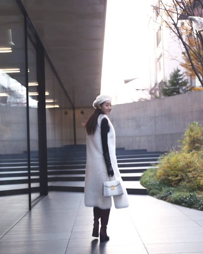 세 번째 사진에서는 윤지민이 화이트 퍼 베스트와 블랙 이너웨어를 매치하여 겨울철 세련된 스타일을 연출했다. 여기에 화이트 베레모와 미니멀한 화이트 핸드백을 더해 통일감을 주면서도 부드러운 이미지를 강조했다. 버건디 컬러의 롱부츠는 룩에 깊이를 더하며, 계절감 있는 디테일로 완벽히 어우러졌다.