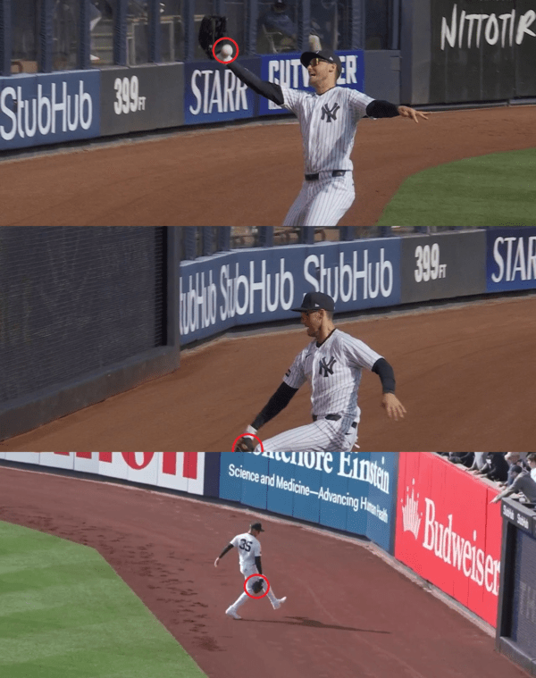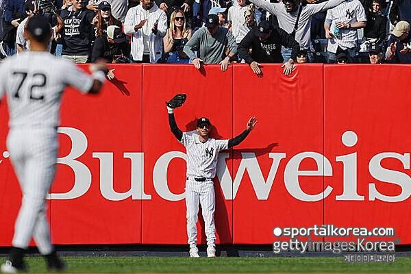 '류현진 前 동료'의 진기명기 작렬! 양키스 2454억 외야수, 믿기지 않는 '2단 캐치'로 2루타 지웠다