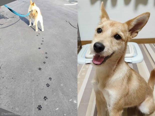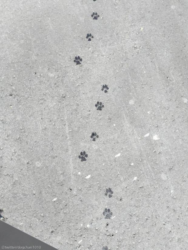 지난 5일 일본의 한 트위터 유저(@dogchan1010)가 올린 이 사진에는 반려견 '이누쨩'이 지나간 자리에 찍힌 발자국들이 보인다.