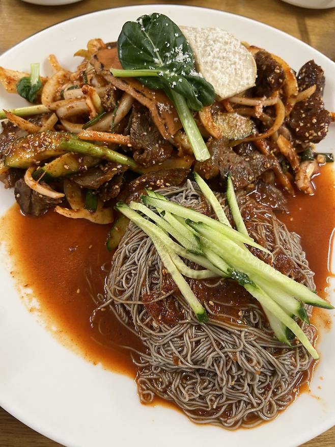 팜유 대원들이 아점을 먹기 위해 찾아간 냉면 수육 무침 전문점. 숯불돼지갈비, 숯불 소갈비, 냉면, 갈비탕, 비빔밥 등 메뉴가 다양한데, 이 집의 별미는 수육 무침이다. 돼지갈비 수육 무침과 소갈비 수육 무침 중 나혼산에서 맛본 메뉴는 소갈비 수육 무침! 비빔 국수와 소갈비가 한 접시에 나오는 흔치 않은 비주얼에 군침이 돈다. 소갈비 수육 무침은 소진이 빠른 편이라고 하니 팜유와 똑같은 메뉴를 맛보고 싶다면 서두르자!